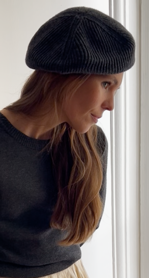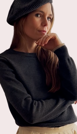 Amande, le gilet tricoté en Bretagne, en laine mérinos gris chiné, douce et confortable. Il est rehaussé d’un fin liseré beige au bas des manches.